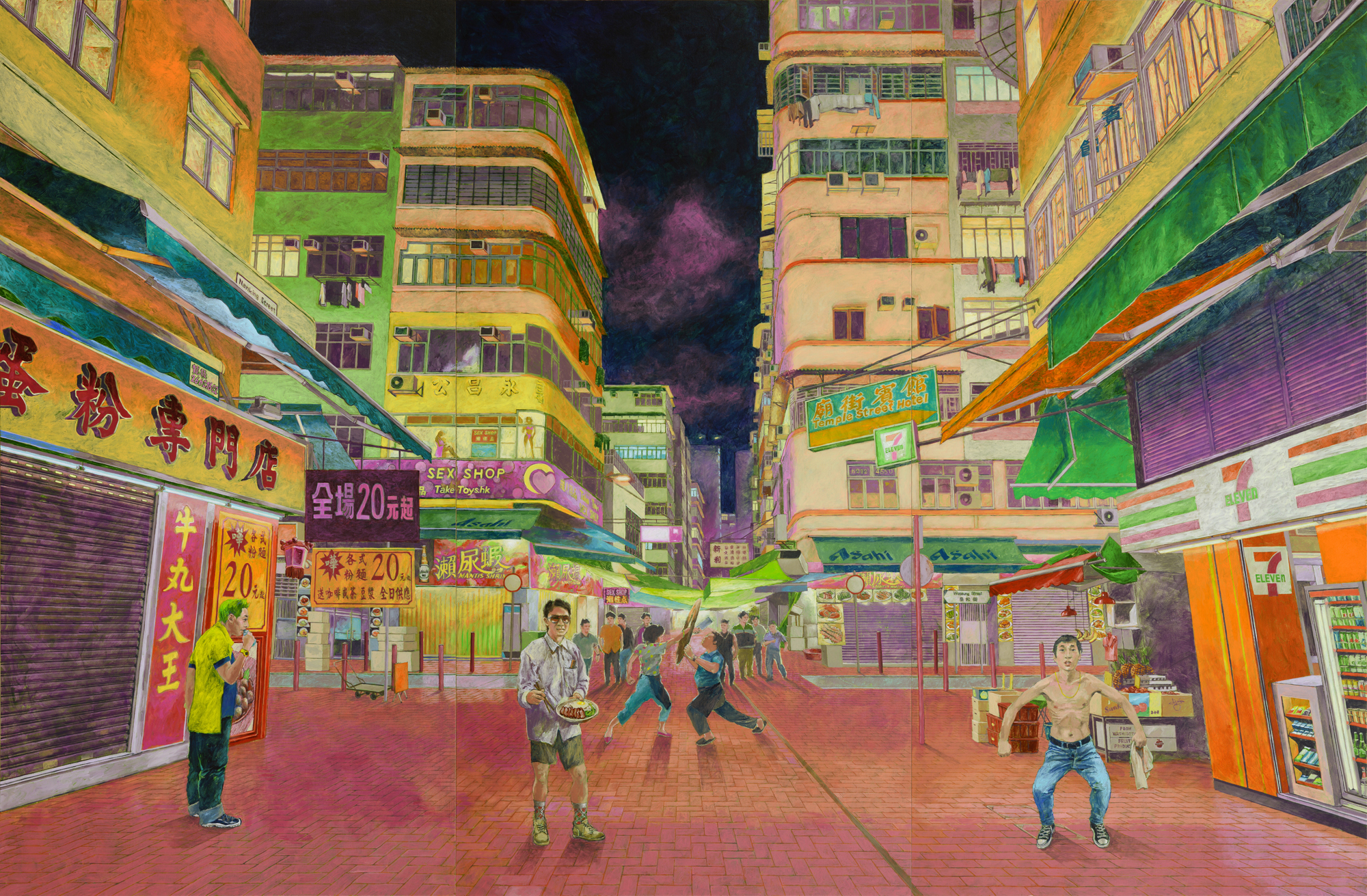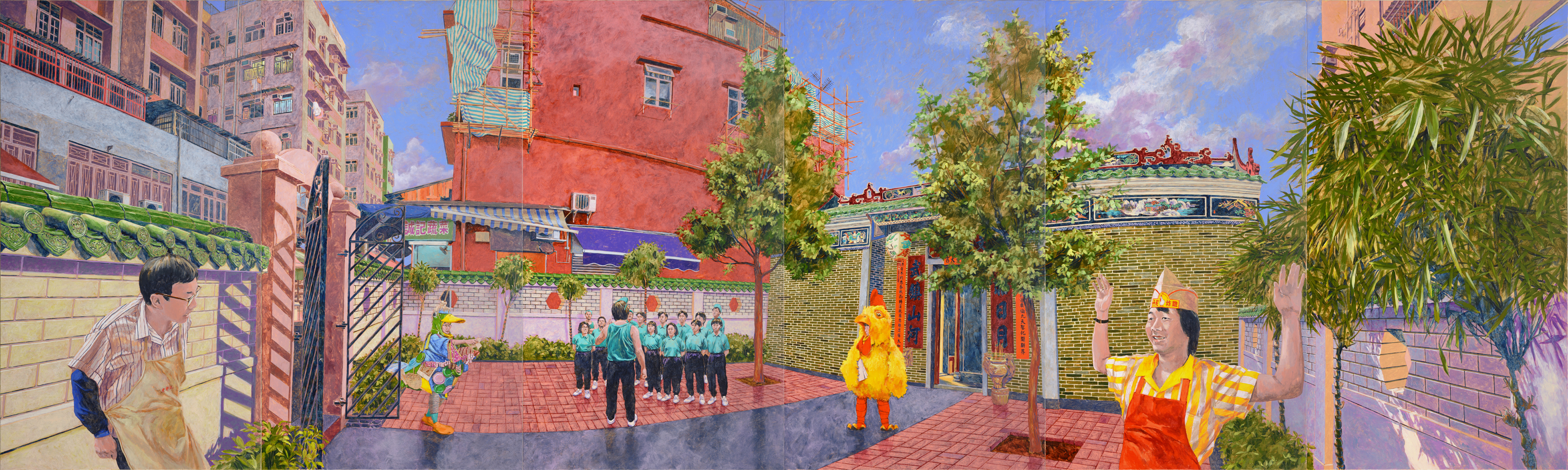 Chicken and Duck Talk 1988 at Tai Po Man Mo Temple, acrylic on canvas, 180cm(H) x 600cm(W) Hexaptych, 2024
